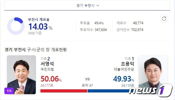 경기 부천 국힘 서영석 50 06 Vs 민주당 조용익 49 93 67표차 초박빙